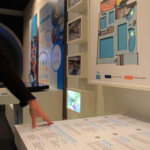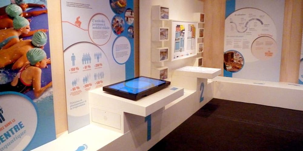 La scénographie ludique et interactive de cette exposition permet de comprendre les enjeux et le développement du projet de construction du futur centre aquatique de Vitry-sur-Seine. Tout ici évoque de manière stylisée la piscine: les sons, les grandes images immersives, le décor, le graphisme, l’ambiance lumineuse et le sas “pédiluve” où le visiteur est face à une très grande image rétroéclairée donnant l’illusion d’entrer dans le futur centre. Une bande blanche périphérique est le support de panneaux, totems interactifs et jeux pour enfants illustrés.